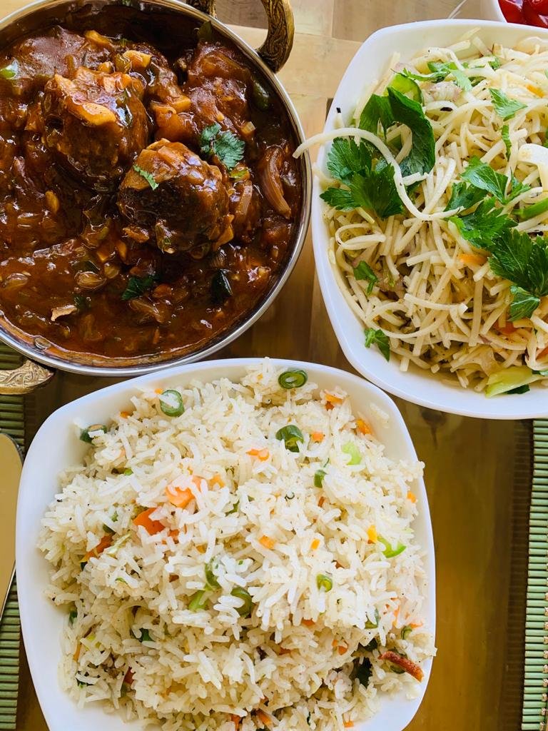 Pipping hot Tomato soup and Gobi chilliHerbed noodles, veg fried rice and veg manchurian